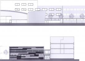 El lado transversal se realiza mediante una zona transparente, la cual configura una franja entre la parte construida y la proyectada. Aquí se ubicará la sala de profesores en la planta primera y uno de los accesos en la planta baja.