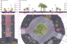 La sección planteada está compuesta por un solo carril de circulación de 3,2 metros de rigola + rigola de 0,30 metros, dos carriles destinados al aparcamiento de coches de 1,80 metros + rigola de 0,30 metros y aceras simétricas con anchura variable de entre 3,65 metros y 3,70 metros. | |